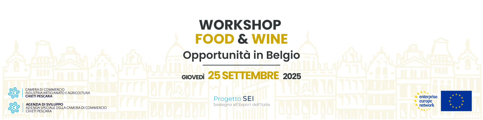 Nell’ambito del Progetto SEI – Sostegno all’Export dell’Italia, la Camera di Commercio Chieti Pescara e la sua Agenzia di Sviluppo, in collaborazione con la Camera di commercio Belgo-Italiana, organizza “Workshop Food&Wine – Belgio”. L’evento si terrà giovedì 25 settembre 2025 presso la Sala Camplone - CCIAA Chieti Pescara, sede di Pescara.