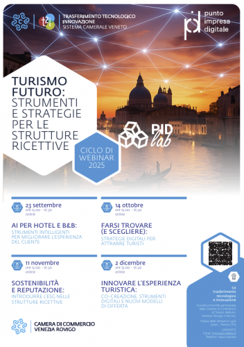 Il ruolo di Google, TripAdvisor e OTA. SEO locale e scheda Google My Business. Social media: quale usare e come. E-mail marketing per fidelizzare i clienti. Budget minimo, massimo impatto: casi di successo. Questi in sintesi gli argomenti che saranno affrontati nel webinar del prossimo 14 ottobre dalle 15.00 alle 16.30, promosso dall’Ufficio PID della Camera di Commercio di Venezia Rovigo in collaborazione con t2i trasferimento tecnologico e innovazione.