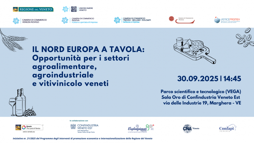 Partecipa alla tavola rotonda "IL NORD EUROPA A TAVOLA: OPPORTUNITÀ PER I SETTORI AGROALIMENTARE, AGROINDUSTRIALE E VITIVINICOLO VENETI", che si terrà martedì 30 settembre presso la Sala Oro di Confindustria Veneto Est, Parco Scientifico e Tecnologico VEGA (via delle Industrie 19, Marghera – VE).