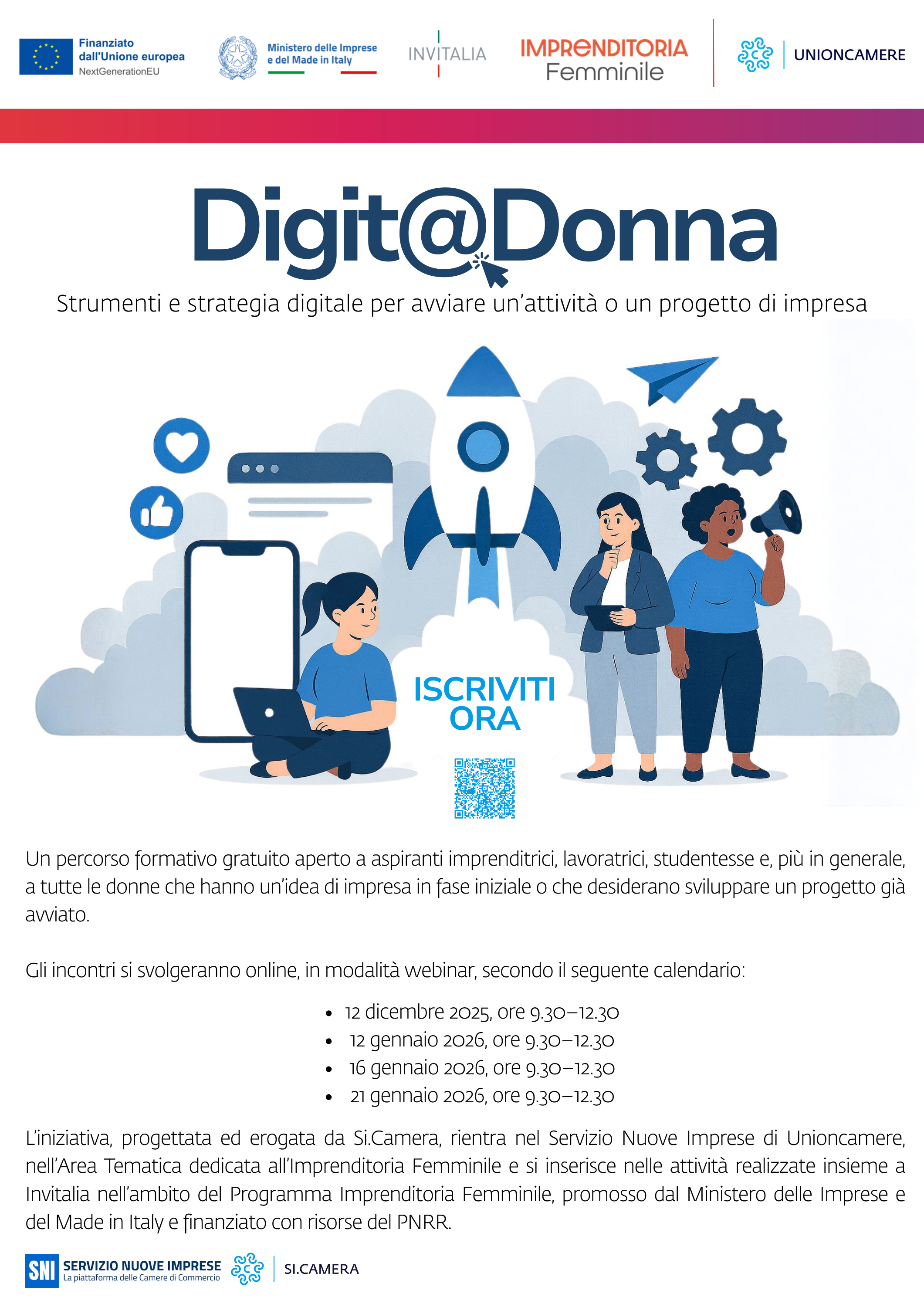 L’iniziativa fa parte dell’Area Tematica del Servizio Nuove Imprese dedicata all’Imprenditoria Femminile e implementata nell’ambito delle attività progettuali realizzate da Unioncamere e Invitalia per il programma Imprenditoria Femminile promosso dal Ministero delle Imprese e del Made in Italy a valere su risorse del PNRR.