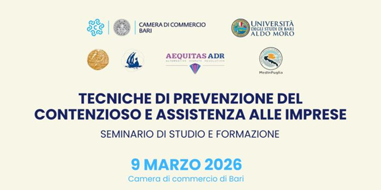 Tecniche di prevenzione del contenzioso, corretta gestione dei rapporti contrattuali e strumenti alternativi di risoluzione delle controversie al centro del seminario di studio e formazione in programma lunedì 9 marzo 2026, alle ore 14.45, presso la Camera di Commercio di Bari.
