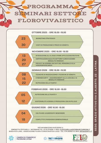 La Camera di Commercio di Frosinone Latina e l’Azienda Speciale Informare, in collaborazione con l’Associazione Filiera Florovivaistica del Lazio, organizzano per il settore florovivaistico delle province di Frosinone e Latina un percorso di seminari gratuiti erogati in presenza e in modalità webinar nato dall’analisi del fabbisogno del settore e volto a migliorare le competenze e favorire la crescita delle aziende sotto ogni aspetto.