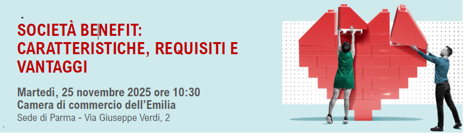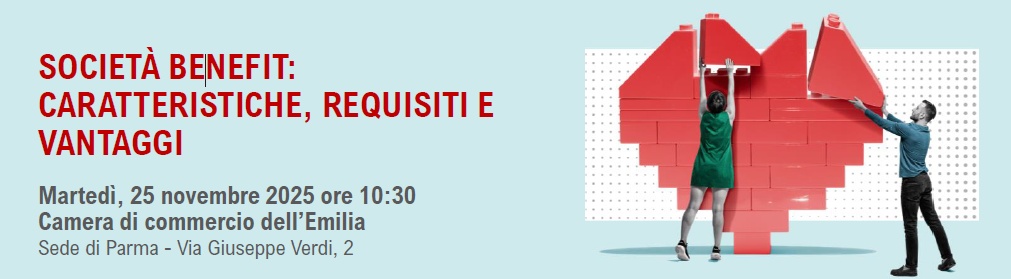 La Camera di commercio dell'Emilia organizza il seminario "Società Benefit: caratteristiche, requisiti e vantaggi" che si terrà il 25 novembre 2025 alle ore 10:30.