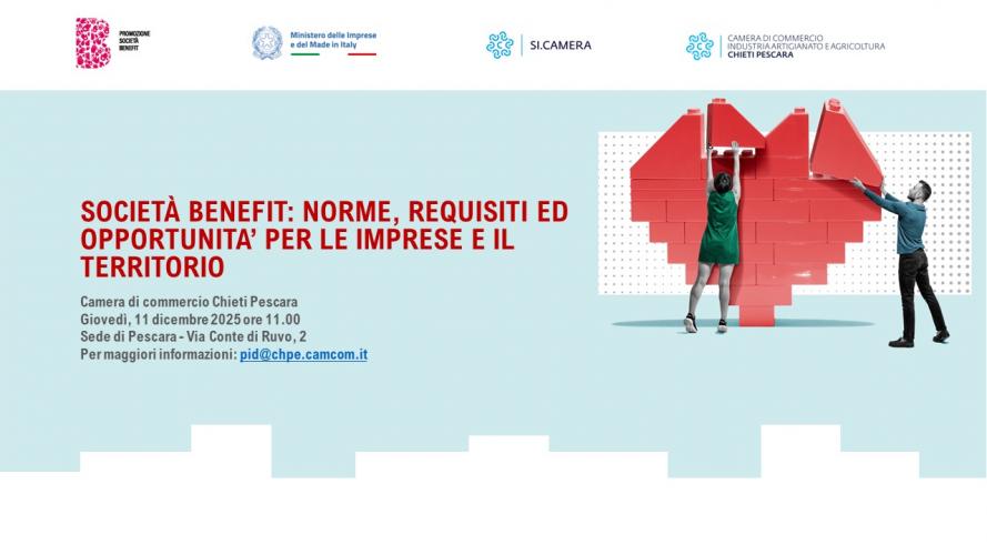 La Camera di commercio Chieti Pescara, nell’ambito del programma nazionale di promozione delle Società Benefit promosso dal Ministero delle Imprese e del Made in Italy in collaborazione con Unioncamere, organizza un incontro di approfondimento in cui saranno approfonditi i vantaggi per le aziende che scelgono questo modello – dalla reputazione al posizionamento competitivo, dall’accesso a nuovi mercati ai riflessi sul territorio – evidenziando come l’evoluzione normativa e la crescente attenzione alla responsabilità d’impresa stiano rendendo sempre più strategico un approccio orientato al valore condiviso.