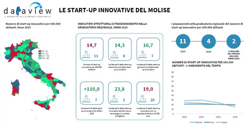 Particolarmente significativo l’andamento nel medio periodo: tra il 2016 e il 2025 il numero di start-up innovative è cresciuto del +110%, collocando il Molise al 7° posto in Italia per dinamica di crescita.