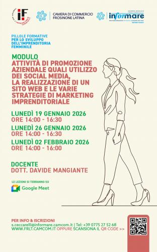Con questo webinar, promosso dal Comitato per l’Imprenditoria Femminile della Camera di Commercio di Frosinone Latina con la collaborazione di Informare, vi aiuteremo a padroneggiare le tecniche di web e social media marketing per dare all’azienda maggiore visibilità online, incrementare le vendite, favorire la redemption delle campagne, acquisire informazioni di dettaglio sui prospect e raggiungere un ROI più elevato. Sono previsti 3 moduli per le giornate di lunedì 19 gennaio, ore 14:00 -16:30, lunedì 26 gennaio, ore 14:00 – 16:30, e lunedì 2 febbraio ore 14:00 -16:00 che si terranno sulla piattaforma Google Meet.