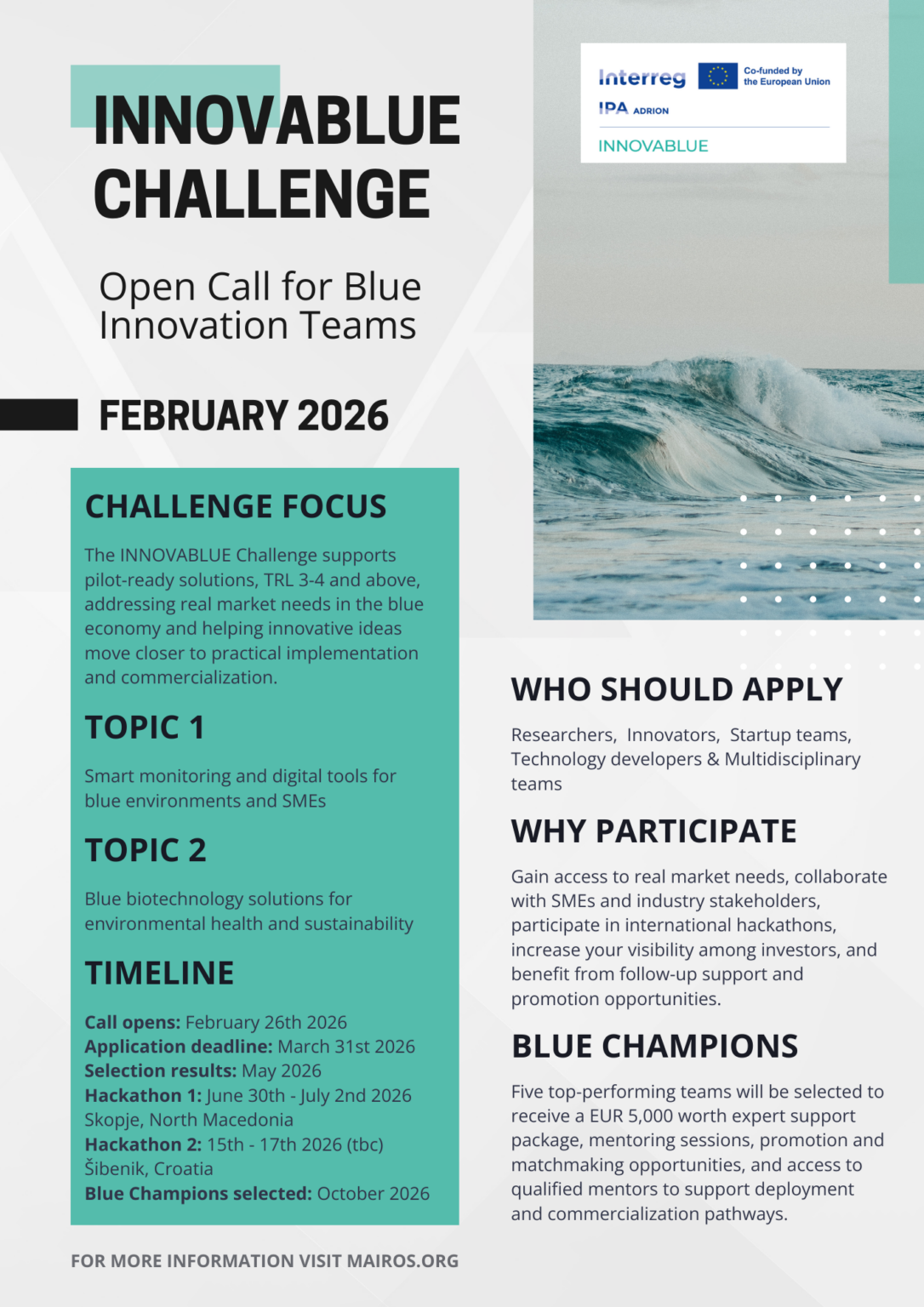 Il bando si è aperto il 26 febbraio 2026. Per partecipare, è necessario registrare il proprio team entro e non oltre le ore 12:00 del 30 aprile 2026 attraverso la piattaforma Mairos: https://mairos.org/news/innovablue-challenge-open-call-for-blue-innovation-teams/.