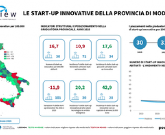 Il Centro Studi Tagliacarne ha diffuso l'infografica che riporta una panoramica della situazione delle start-up innovative in provincia di Modena a confronto con le medie nazionali. Tre indicatori sui sei presentati sono superiori alla media nazionale.